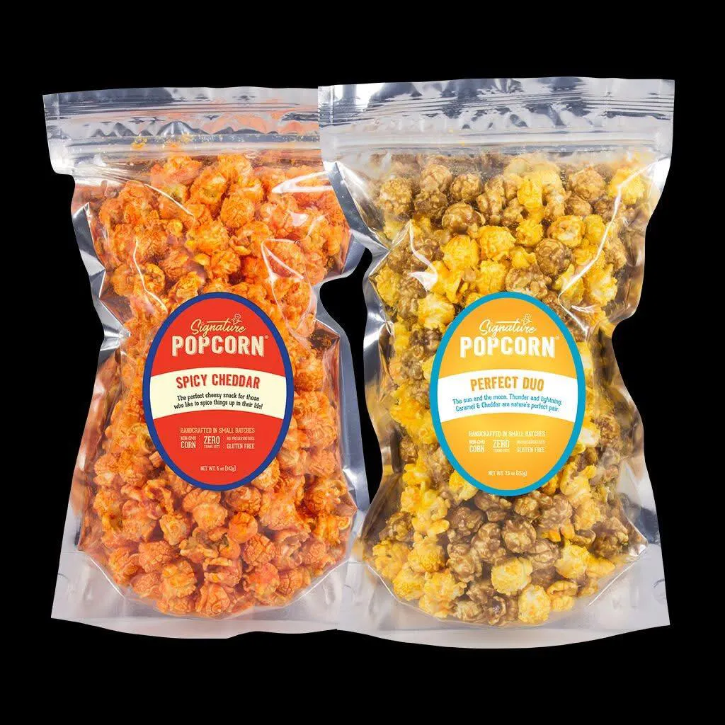 Our large resealable bags are a great value! They're perfect for movie nights, gift baskets, parties and snacking! They are resealable to maintain freshness (but, we know it's hard not to eat it all in one sitting)! Choose which two flavors you would like and we'll make them just for you!